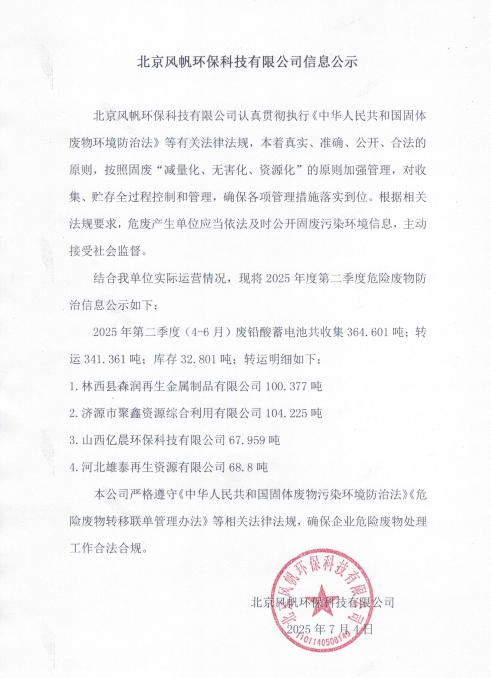 北京風帆環保科技有限公司2025年第二季度危險廢物防治信息公示