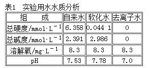 亞硫酸鹽空氣氧化在250 mL玻璃燒杯中進(jìn)行,試驗(yàn)液量200 mL。試驗(yàn)用亞硫酸鹽為化學(xué)純亞硫酸鈉(SS)。SS的初始質(zhì)量濃度為10%。催化亞硫酸鹽CSS由分析純五水硫酸銅和SS制得,催化劑用量為SS質(zhì)量的1%。穩(wěn)定亞硫酸鹽SSS〔6〕由SS和自由基吸收劑Vc制得,穩(wěn)定劑用量為SS質(zhì)量的1.5%。實(shí)驗(yàn)用水為自來(lái)水(TW)及其軟化水(SW)和去離子水(DW),其成分見(jiàn)表1。水質(zhì)分析、SS含量測(cè)定及水中溶解氧的測(cè)定符合GB1576—1996標(biāo)準(zhǔn)。