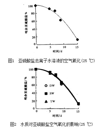 1)關(guān)于亞硫酸鹽防腐效果有時(shí)不佳的原因主要是由于亞硫酸鹽的貯存氧化失效。在實(shí)驗(yàn)條件下,亞硫酸鹽因貯存而自動(dòng)氧化的量占99.93%,起有效防腐作用的量?jī)H占0.07%。水質(zhì)和pH值等條件對(duì)亞硫酸鹽的貯存氧化幾乎沒(méi)有影響,銅離子等d區(qū)元素則有促進(jìn)作用。