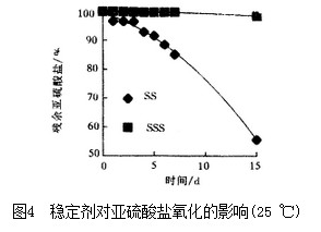3)穩(wěn)定亞硫酸鹽可從自由基吸收劑制得。在模擬工業(yè)現(xiàn)場(chǎng)條件下進(jìn)行的一系列試驗(yàn)結(jié)果表明,穩(wěn)定亞硫酸鹽具有很好的貯存穩(wěn)定性,它能夠方便、經(jīng)濟(jì)、有效地解決亞硫酸鹽的氧化失效問(wèn)題。