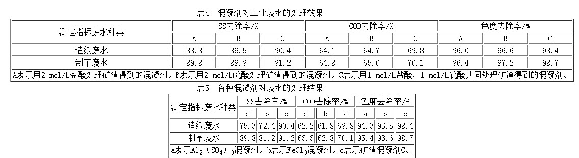 用酸處理礦渣制得的混凝劑分別對造紙廢水及制革廢水進(jìn)行混凝實(shí)驗(yàn),結(jié)果見表4。