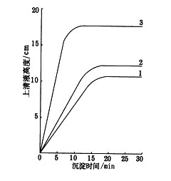 與單一的Al2(SO4)3混凝劑和單一的FeCl3混凝劑相比。酸浸蝕的礦渣混凝劑之優(yōu)點(diǎn)為:1)礦渣混凝劑不僅具備混凝的作用,而且礦渣顆粒具有松散的多孔結(jié)構(gòu)而有很好的吸附作用;2)礦渣混凝劑中含有Al2(SO4)3、FeCl3、AlCl3、Fe2(SO4)3、FeSO4、H2SiO3等多種成分的混凝物質(zhì)。這些物質(zhì)水解可形成許多復(fù)雜的多核絡(luò)合物,這些絡(luò)合物不斷縮聚反應(yīng),逐漸形成了高分子聚合物,隨著縮聚反應(yīng)的不斷進(jìn)行,聚合物的電荷不斷升高,這更有利于吸引廢水中懸浮的膠體雜質(zhì);3)在混凝攪拌的過程中,礦渣懸浮于不斷產(chǎn)生絡(luò)合物的廢水當(dāng)中,許多絡(luò)合物和高分子聚合物將礦渣顆粒包裹在中間,由于礦渣的吸附性使它們形成了一個較大的懸浮體。當(dāng)停止攪拌時,這些包含有礦渣顆粒的懸浮體會迅速的沉降,因而提高了混凝的速度,廢水處理的上清液高度測量結(jié)果見圖1。
