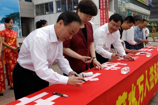 圖為專程到桂林參加節(jié)水宣傳周活動(dòng)啟動(dòng)儀式的建設(shè)部城建司副巡視員曹南燕(左二),桂林市副市長劉明昱(左一)等領(lǐng)導(dǎo)參加節(jié)水萬人簽名活動(dòng)