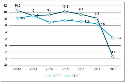 2012-2018環(huán)保行業(yè)年平均ROE及ROIC變化