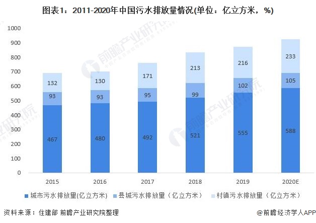 根據(jù)中國(guó)住建部的《城市建設(shè)統(tǒng)計(jì)年鑒》數(shù)據(jù)顯示,2011-2019年中國(guó)污水排放量逐年增長(zhǎng),2019年中國(guó)城市污水排放量為555億噸,縣城污水排放量為102億噸,村鎮(zhèn)污水排放量為216億噸,合計(jì)873億噸,我國(guó)的污水處理工作刻不容緩;前瞻初步測(cè)算,中國(guó)2020年城市污水排放量為588億噸,縣城污水排放量為105億噸,村鎮(zhèn)部分污水排放量為233億噸,合計(jì)926億噸。